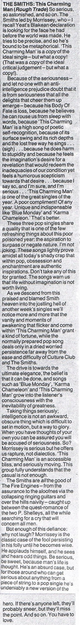 NME – 12 November 1983 Posted byNick StuckenborgJanuary 1, 2020August 16, 2022Posted inNMETags:1983 Review, NME, review, Smiths Review Paul Morley Review Share this: Share on X (Opens in new window) X Share on Facebook (Opens in new window) Facebook Like Loading... Related Published by Nick Stuckenborg Archivist. Cinematographer. View more posts