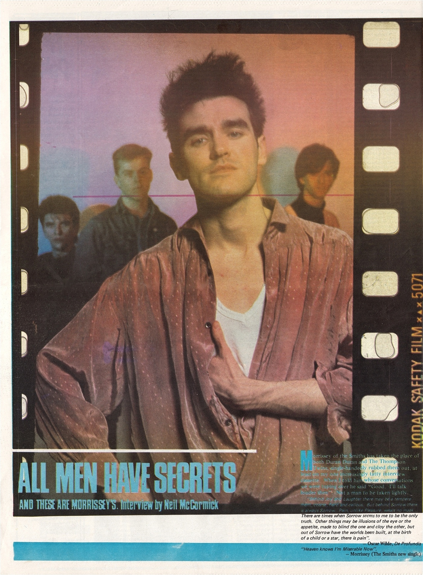 “Morrissey interview by Neil McCormick “The Secret Life Of Morrissey ” / “All Men Have Secrets And These Are Morrissey’s”. Cover photo. Topics: image, Ireland, Manchester and London, before the Smiths, love life, being a pop star, fans, suicide, death, religion, happiness, the Smiths.”