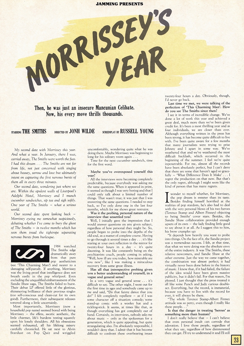 Jamming – December 1984 Posted byNick StuckenborgJanuary 5, 2020May 17, 2020Posted inJammingTags:1984, interview, Jamming, Smiths, Smiths 1984 Share this: Share on X (Opens in new window) X Share on Facebook (Opens in new window) Facebook Like Loading... Related Published by Nick Stuckenborg Archivist. Cinematographer. View more posts