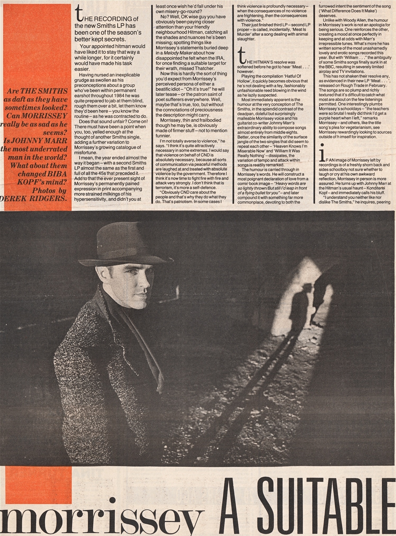 No? Well, OK wise guy you have obviously been paying closer attention than your friendly neighbourhood Hitman, catching all the shades and nuances he’s been missing; spotting things like Morrissey’s statements buried deep in a Melody Maker about how disappointed he felt when the IRA, for once finding a suitable target for their wrath, missed Thatcher.