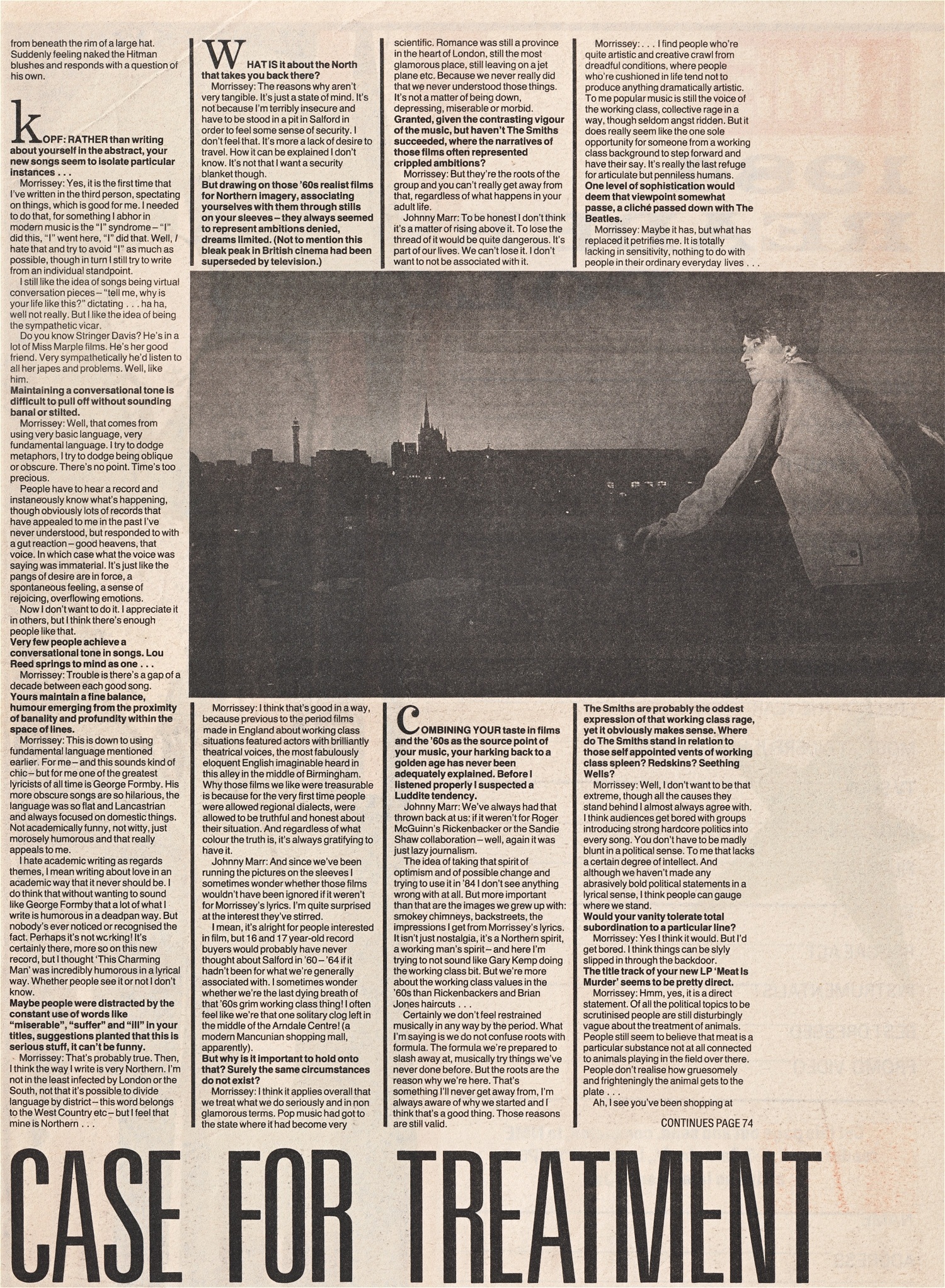 “”A Suitable Case For Treatment”, Morrissey and Marr interview. Photos by Derek Ridgers. Topics: violence, upcoming Meat Is Murder album, schooldays, writing, Northern England, sixties, classes, sexuality, being poor, being miserable.”