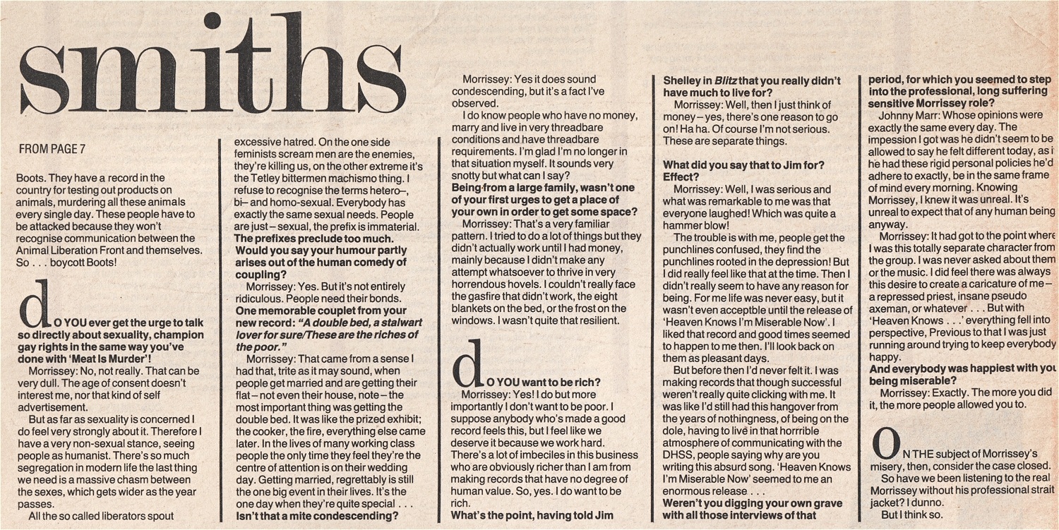 Morrissey: Yes! I do but more importantly I don’t want to be poor. I suppose anybody who’s made a good record feels this, but I feel like we deserve it because we work hard. There’s a lot of imbeciles in this business who are obviously richer than I am from making records that have no degree of human value. So, yes, I do want to be rich.