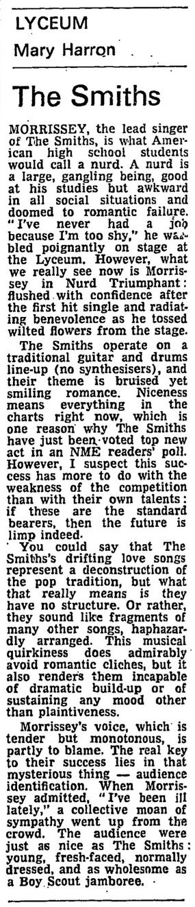 The Guardian – 14 February 1984 Posted byNick StuckenborgJanuary 18, 2020August 16, 2022Posted inThe GuardianTags:1984 Review, review, Smiths Review, The Guardian Share this: Click to share on X (Opens in new window) X Click to share on Facebook (Opens in new window) Facebook Like Loading... Related Published by Nick Stuckenborg Archivist. Cinematographer. View more posts