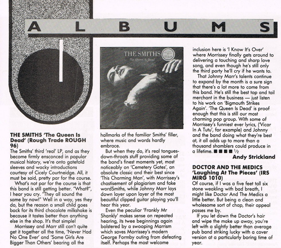 Record Mirror – 14 June 1986 Posted byNick StuckenborgMarch 8, 2020Posted inRecord MirrorTags:1986 Review, Record Mirror, review, Smiths Review Share this: Click to share on X (Opens in new window) X Click to share on Facebook (Opens in new window) Facebook Like Loading... Related Published by Nick Stuckenborg Archivist. Cinematographer. View more posts