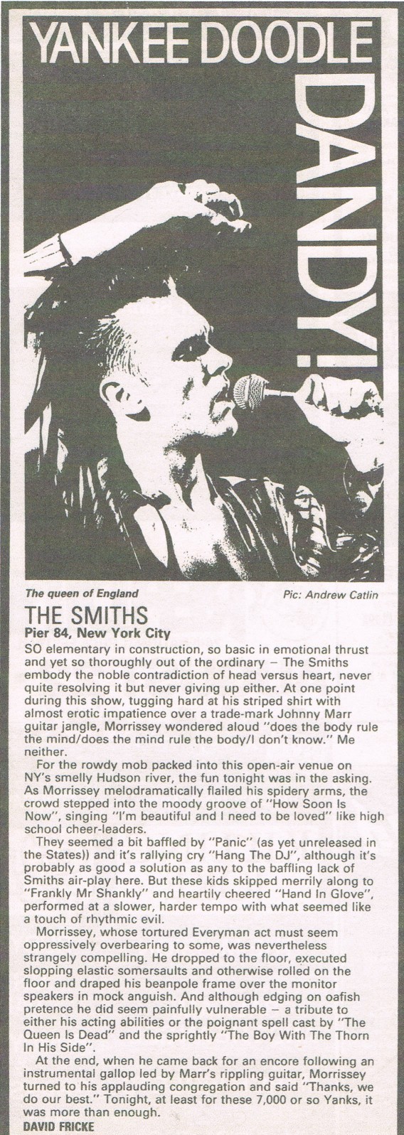 Review – Pier 84, 6 August 1986 Posted byNick StuckenborgMarch 8, 2020Posted inreviewTags:1986 Review, review, Smiths Review Share this: Click to share on X (Opens in new window) X Click to share on Facebook (Opens in new window) Facebook Like Loading... Related Published by Nick Stuckenborg Archivist. Cinematographer. View more posts