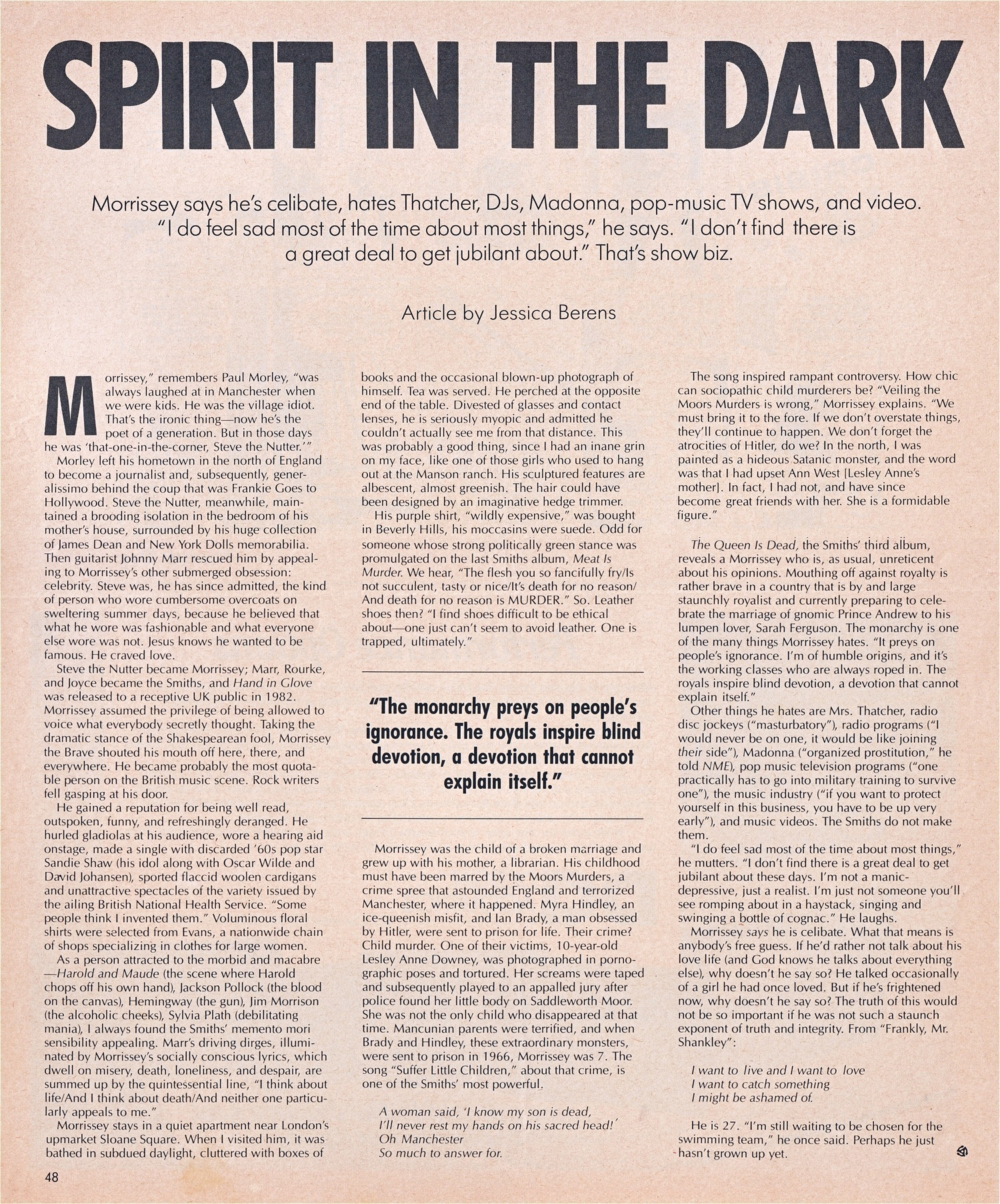 Spin – September 1986 Posted byNick StuckenborgMarch 8, 2020May 17, 2020Posted inSpinTags:1986, interview, Smiths, Smiths 1986, Spin Share this: Click to share on X (Opens in new window) X Click to share on Facebook (Opens in new window) Facebook Like Loading... Related Published by Nick Stuckenborg Archivist. Cinematographer. View more posts