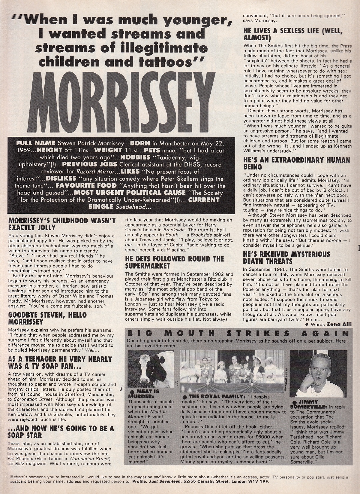 Just Seventeen – March 1988 Posted byNick StuckenborgMay 19, 2020Posted inJust SeventeenTags:1988, 1988 Morrissey, interview, Just Seventeen, Morrissey Share this: Click to share on X (Opens in new window) X Click to share on Facebook (Opens in new window) Facebook Like Loading... Related Published by Nick Stuckenborg Archivist. Cinematographer. View more posts