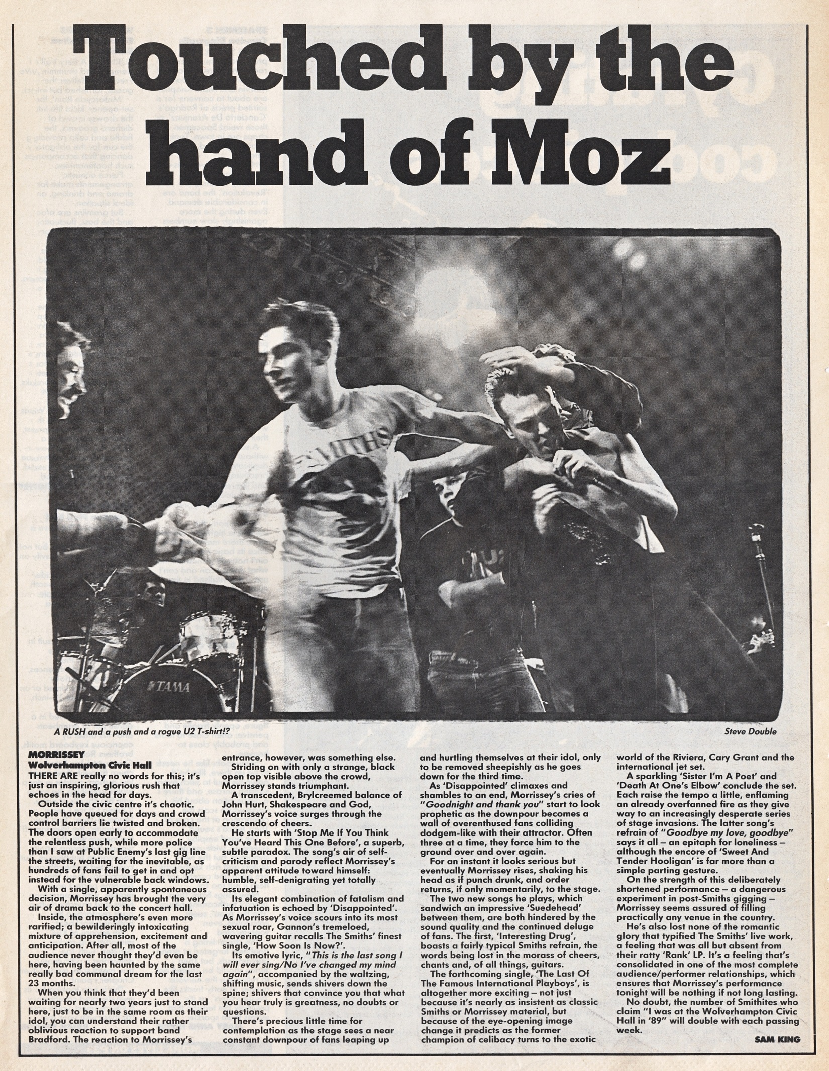 The first solo Morrissey concert, and an unofficial farewell for The Smiths. Craig Gannon filled in for Johnny Marr, and a mix of Smiths songs and a few future Morrissey tracks were played. Anyone wearing a Smiths/Morrissey shirt had free admission, with only roughly half of those who traveled there being admitted inside.