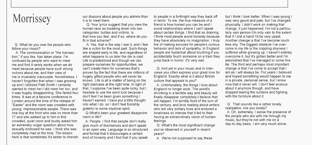 Los Angeles Times – 16 June 1991 Posted byNick StuckenborgOctober 10, 2020Posted inLos Angeles TimesTags:1991, 1991 Morrissey, interview, Los Angeles Times, Morrissey Share this: Share on X (Opens in new window) X Share on Facebook (Opens in new window) Facebook Like Loading... Related Published by Nick Stuckenborg Archivist. Cinematographer. View more posts