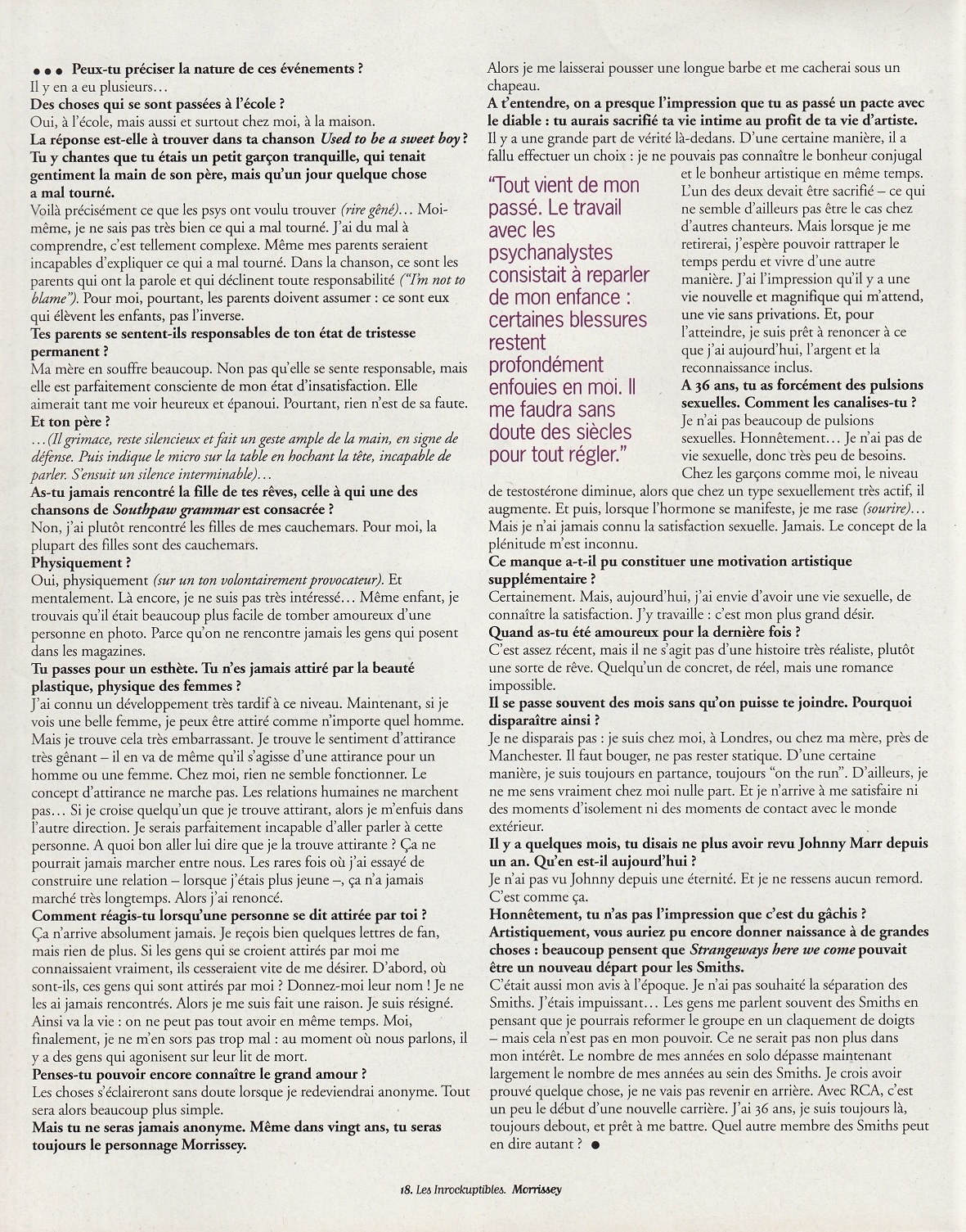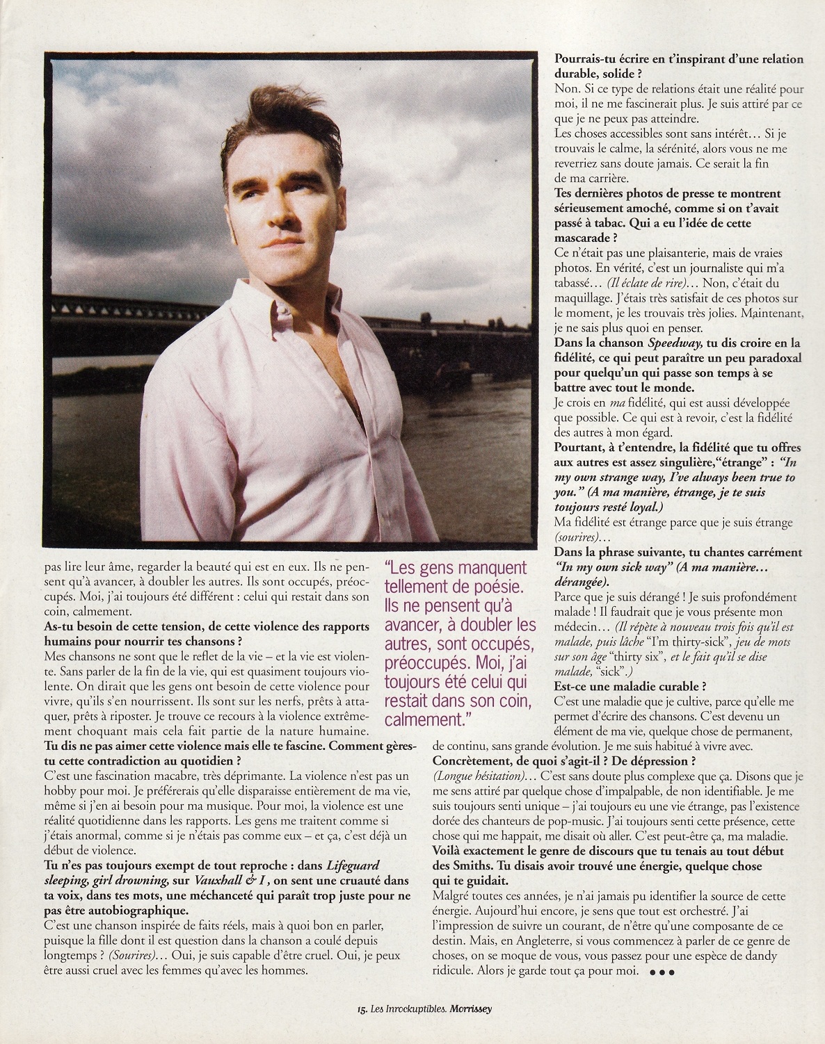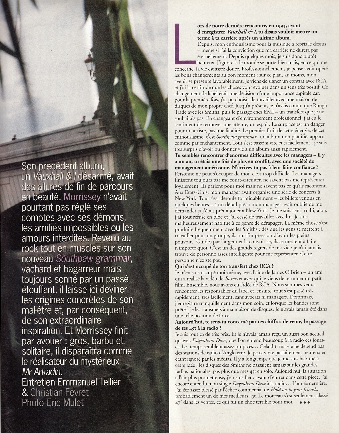 Les Inrockuptibles – September 1995 Posted byNick StuckenborgJanuary 23, 2021Posted inLes InrockuptiblesTags:1995, 1995 Morrissey, interview, Les Inrockuptibles, Morrissey Share this: Share on X (Opens in new window) X Share on Facebook (Opens in new window) Facebook Like Loading... Related Published by Nick Stuckenborg Archivist. Cinematographer. View more posts