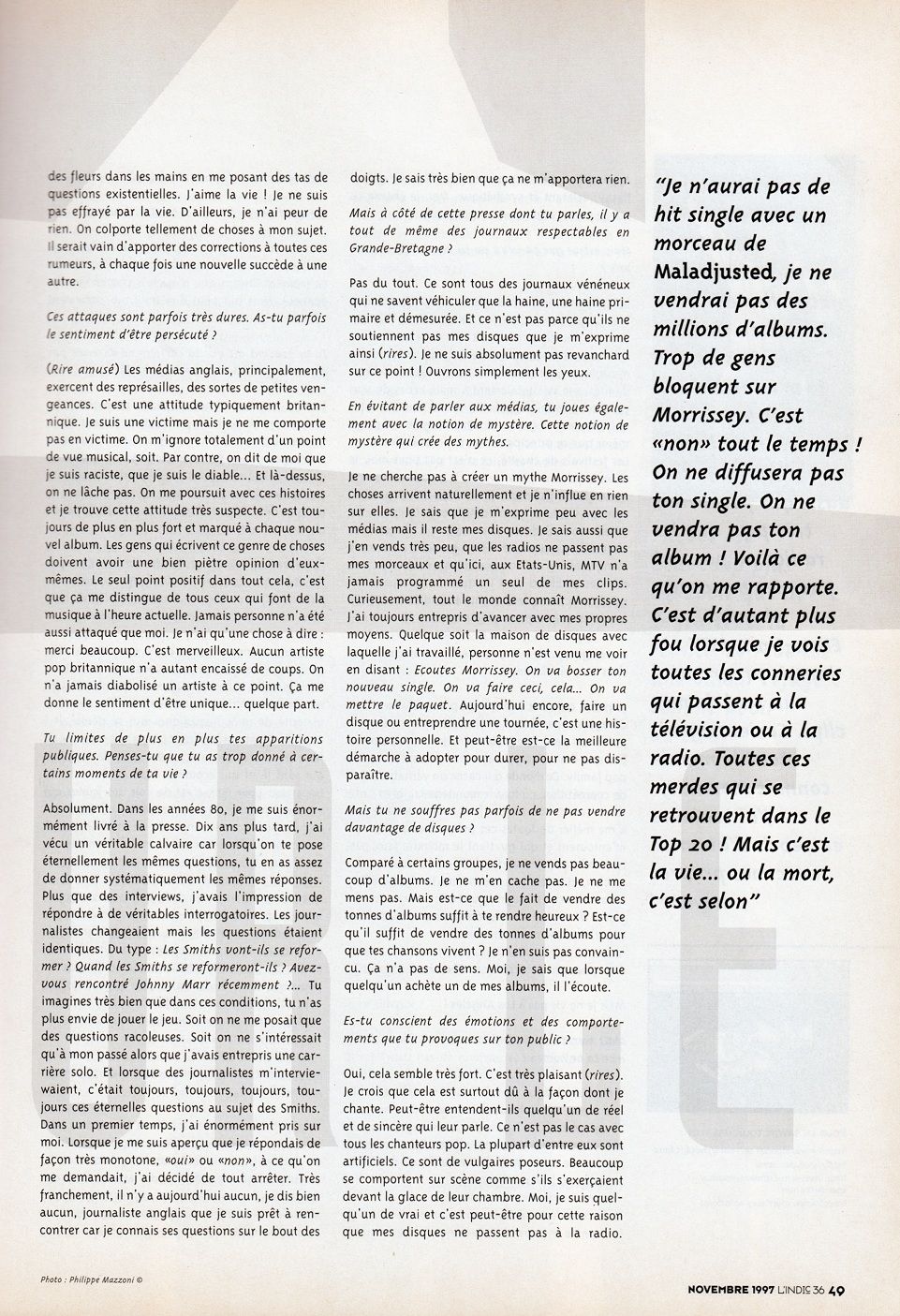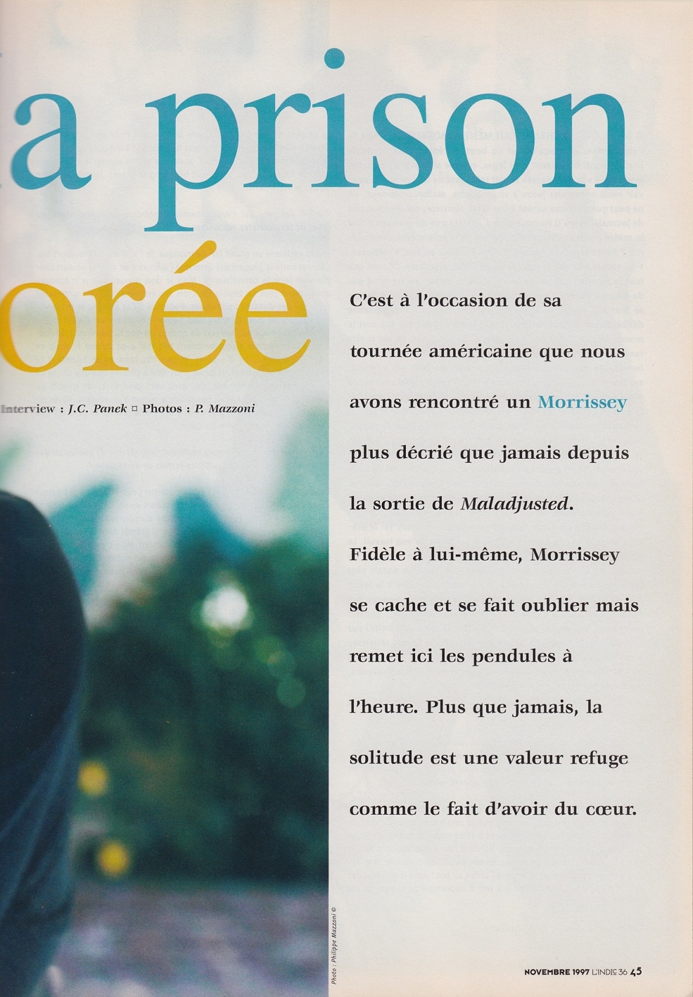 L’indic – November 1997 Posted byNick StuckenborgJanuary 23, 2021Posted inL'indicTags:1997, 1997 Morrissey, French, interview, L'indic, Morrissey English transcript: https://www.morrissey-solo.com/content/interview/indic/index.html Share this: Click to share on X (Opens in new window) X Click to share on Facebook (Opens in new window) Facebook Like Loading... Related Published by Nick Stuckenborg Archivist. Cinematographer. View more posts