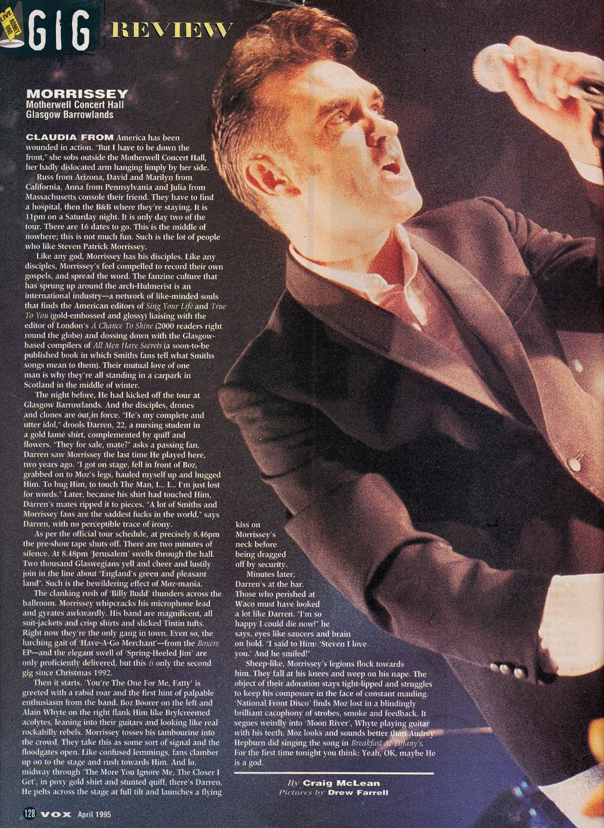 Vox – February 1995 Posted byNick StuckenborgJanuary 23, 2021Posted inreview, VoxTags:1995 Review, Morrissey Review, review, Vox Share this: Share on X (Opens in new window) X Share on Facebook (Opens in new window) Facebook Like Loading... Related Published by Nick Stuckenborg Archivist. Cinematographer. View more posts
