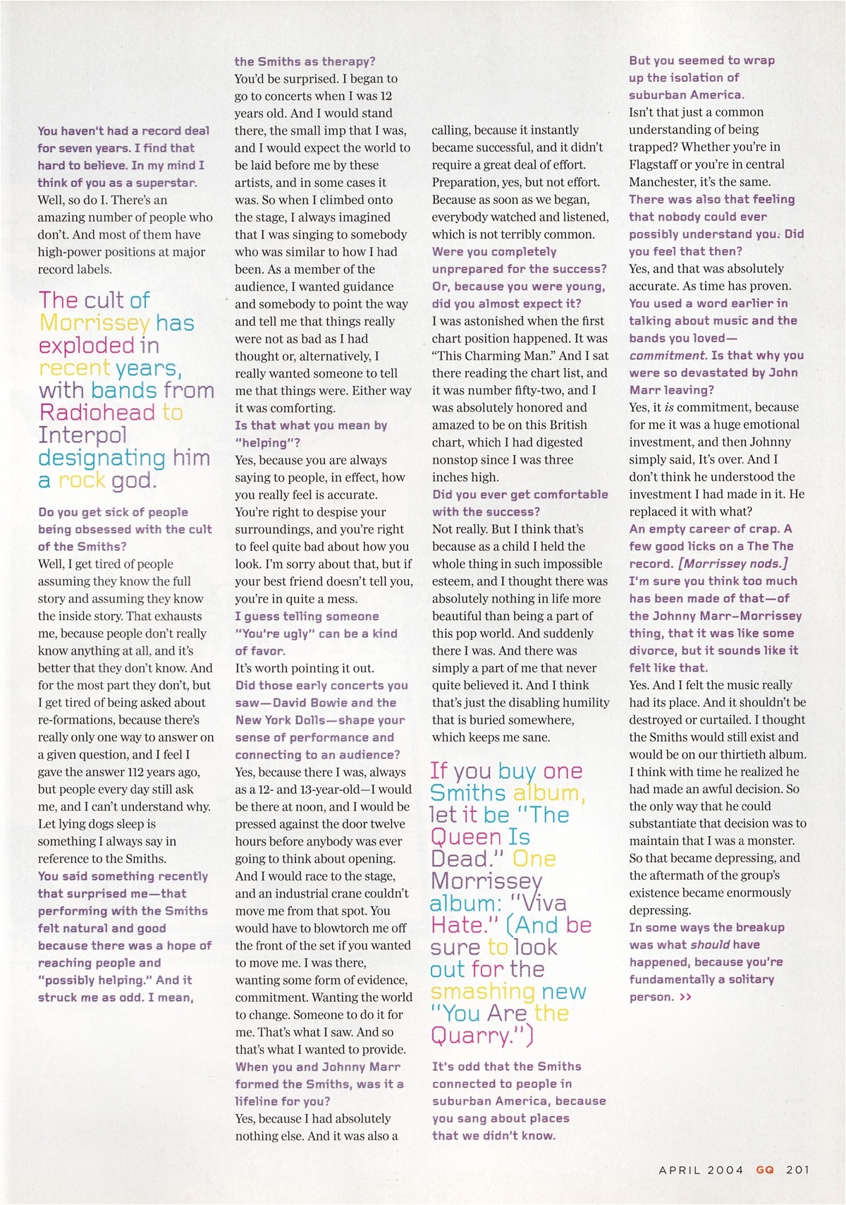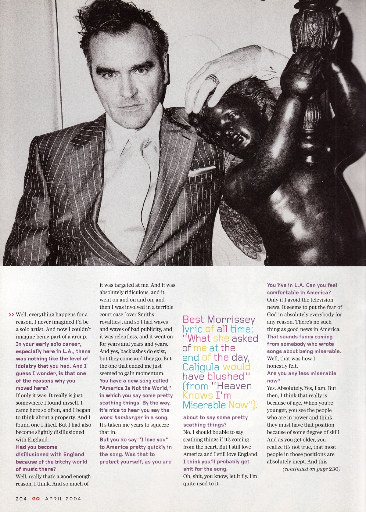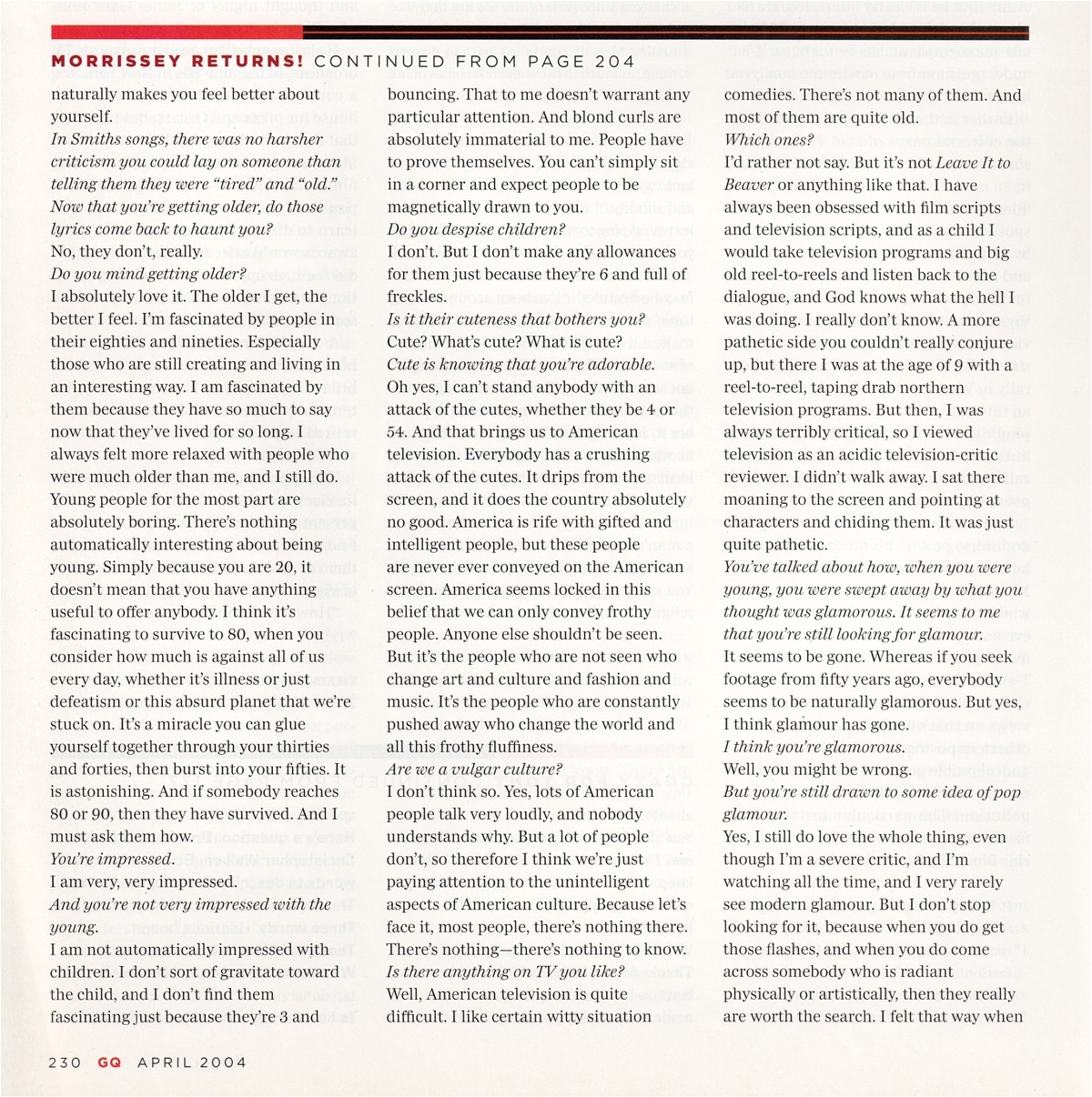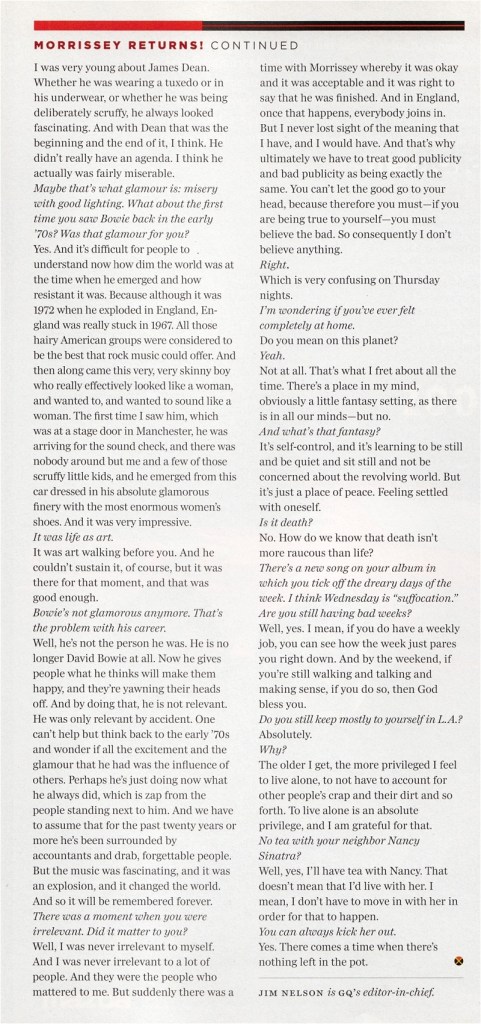GQ – April 2004 Posted byNick StuckenborgJuly 7, 2021Posted inGQTags:2004, 2004 Morrissey, GQ, interview, Morrissey Share this: Share on X (Opens in new window) X Share on Facebook (Opens in new window) Facebook Like Loading... Related Published by Nick Stuckenborg Archivist. Cinematographer. View more posts