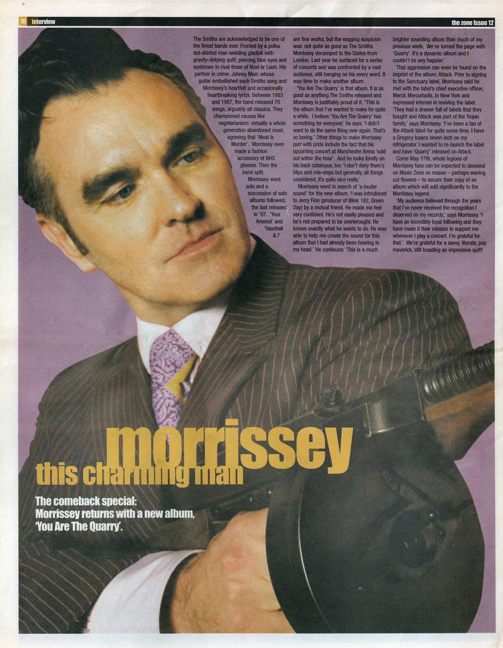 The Zone – May – June 2004 Posted byNick StuckenborgJuly 7, 2021Posted inThe ZoneTags:2004, 2004 Morrissey, interview, Morrissey Share this: Share on X (Opens in new window) X Share on Facebook (Opens in new window) Facebook Like Loading... Related Published by Nick Stuckenborg Archivist. Cinematographer. View more posts