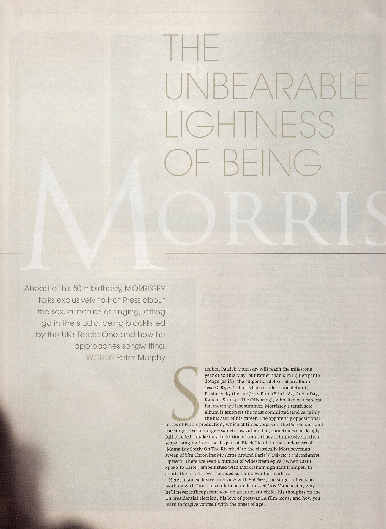 Hot Press – April 2009 Posted byNick StuckenborgApril 16, 2022Posted inHot PressTags:2009, 2009 Morrissey, Hot Press, interview, Morrissey Share this: Click to share on X (Opens in new window) X Click to share on Facebook (Opens in new window) Facebook Like Loading... Related Published by Nick Stuckenborg Archivist. Cinematographer. View more posts