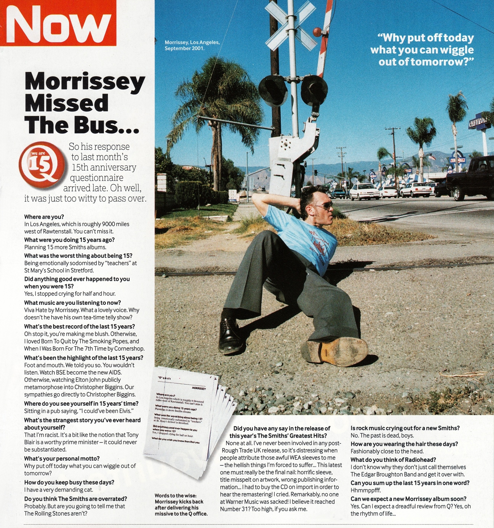 Q – November 2001 Posted byNick StuckenborgNovember 24, 2022Posted inQTags:2001, 2001 Morrissey, interview, Morrissey, Q Share this: Click to share on X (Opens in new window) X Click to share on Facebook (Opens in new window) Facebook Like Loading... Related Published by Nick Stuckenborg Archivist. Cinematographer. View more posts