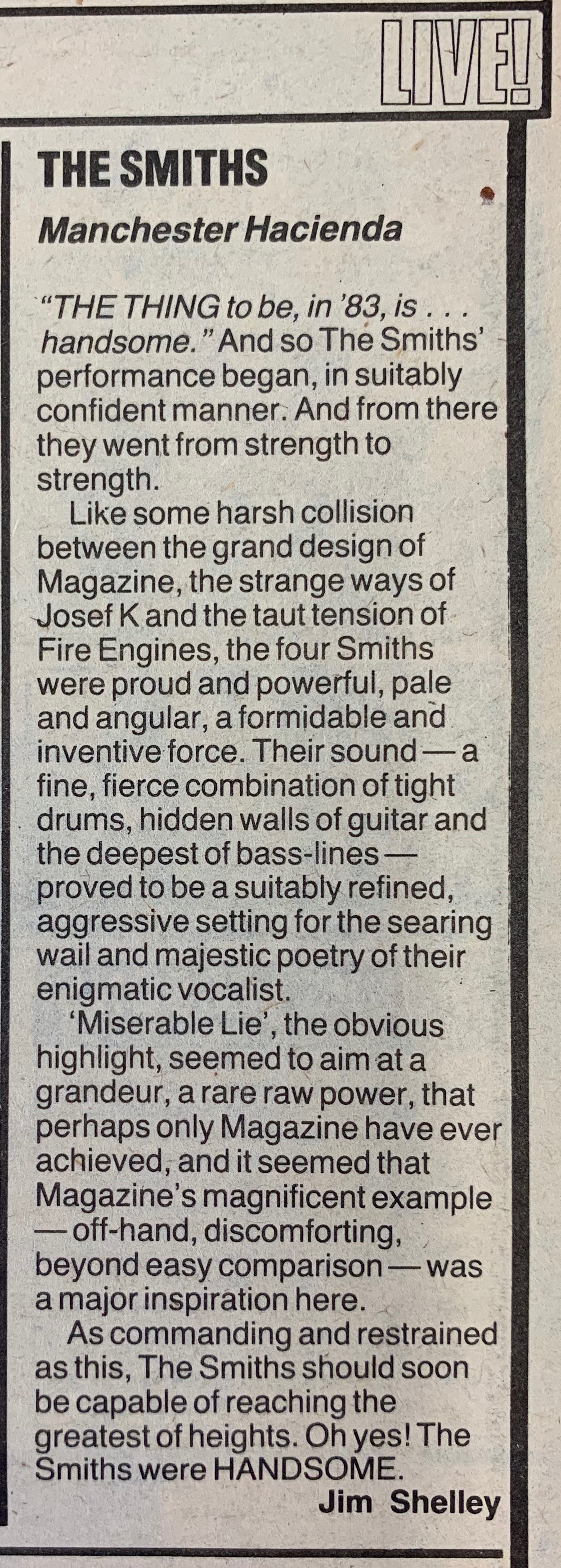 NME – 26 March 1983 Posted byNick StuckenborgSeptember 24, 2023Posted inNMETags:1983, 1983 Review, NME, review, Smiths Share this: Click to share on X (Opens in new window) X Click to share on Facebook (Opens in new window) Facebook Like Loading... Related Published by Nick Stuckenborg Archivist. Cinematographer. View more posts