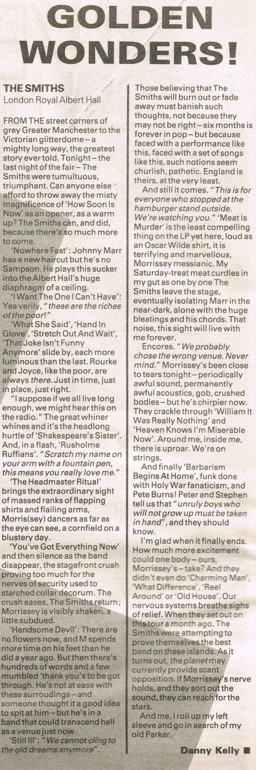 Danny Kelly gives a very positive review of The Smiths live at Royal Albert Hall on 6 April 1985