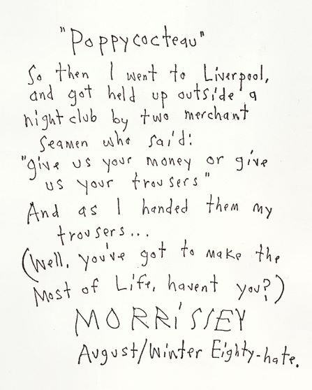 This edition of the magazine also included a free 7” flexi disc containing a live version of The Smiths’ “London”, and a handwritten Morrissey poem titled “Poppycocteau” on the flexi’s surface.”