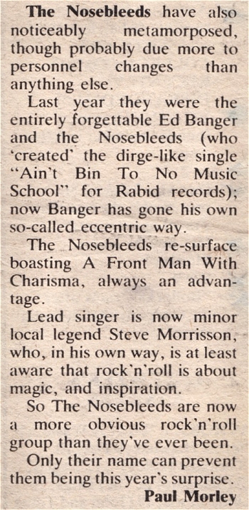 Paul Morley reviews The Nosebleeds, now fronted by some “Steve Morrisson”.