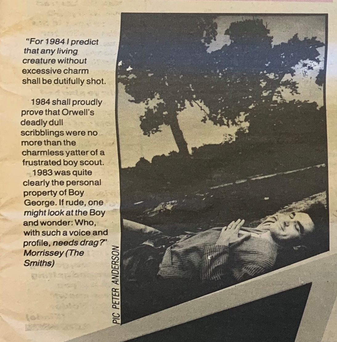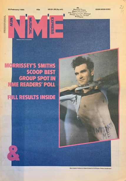“Photo of Morrissey by Peter Anderson on cover. The issue includes their best of 1984 poll results where The Smiths were voted best group, Johnny Marr best instrumentalist and Morrissey/Marr best songwriters. The band, Morrissey or Marr are also listed at different positions in the ‘best new act’, ‘best male singer’, ‘best single’, ‘best album’, ‘best dressed sleeve’, ‘best dressed person’, ‘most wonderful human being’ and ‘creep of the year’ categories.” – PJLM